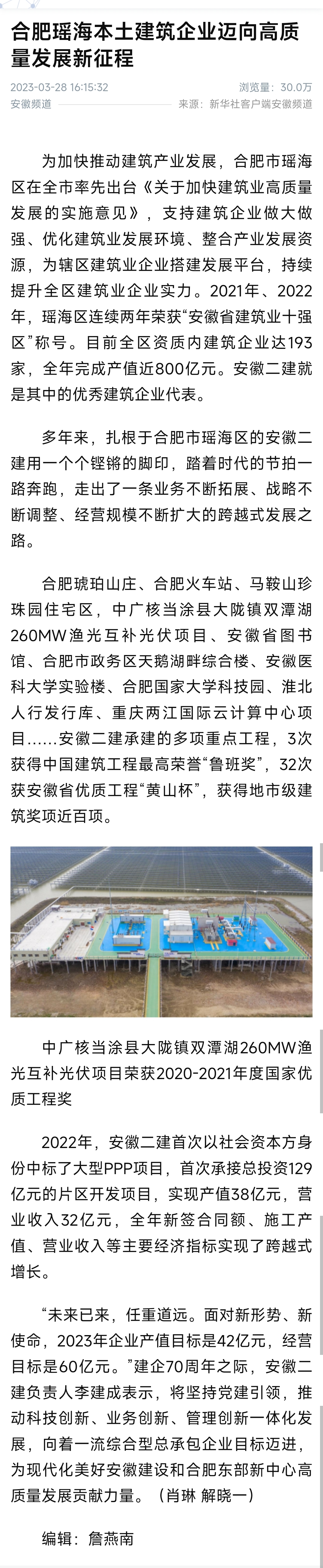 時光向前,二建向上!3月28日,自人民網、央廣網、中國網、中國日報網、安徽日報客戶端等主流媒體集中報道安徽二建七十年發(fā)展成就后,公司作為合肥瑤海本土優(yōu)秀建筑企業(yè)邁向高質量發(fā)展新征程,首次刊登在新華社客戶端安徽頻道,一經報道瀏覽量達30萬次。
