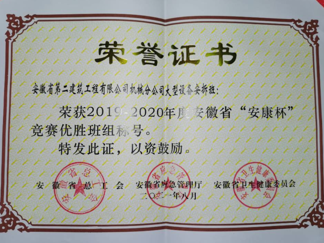 安徽二建公司機(jī)械分公司大型設(shè)備安拆班是一支負(fù)有戰(zhàn)斗力的班組,擔(dān)負(fù)全公司大型設(shè)備安拆維保任務(wù)。安拆班現(xiàn)有職工18人,包含4名黨員,4名入黨積極分子,主要負(fù)責(zé)大型設(shè)備的安拆、加節(jié)、維修保養(yǎng)及施工現(xiàn)場外電防護(hù)安裝作業(yè)等工作。多年來,安拆班始終堅持安全生產(chǎn)理念,開展以“安全生產(chǎn)月”“安康杯”為重點的競賽活動。從細(xì)節(jié)入手,樹立零違章理念,堅持教育和懲罰相結(jié)合,落實責(zé)任、夯實基礎(chǔ),避免不安全事件的發(fā)生。通過強(qiáng)化管理較好的完成各項指標(biāo),班組曾多次獲得建工集團(tuán)、公司“先進(jìn)集體”等多項榮譽(yù)稱號,2019年,分公司被合肥市建筑工程協(xié)會評為“2018年度起重設(shè)備安全管理先進(jìn)企業(yè)”,次年,又被合肥市建筑工程協(xié)會評為“2019年度合肥市建筑業(yè)優(yōu)秀起重設(shè)備安裝工程專業(yè)承包企業(yè)”。2020年,分公司大型設(shè)備安拆班榮獲2019-2020年度安徽省“安康杯”競賽優(yōu)勝班組稱號,這份榮譽(yù)屬于公司,也屬于每一個奮勇投身特種設(shè)備安全的一線作業(yè)人員。