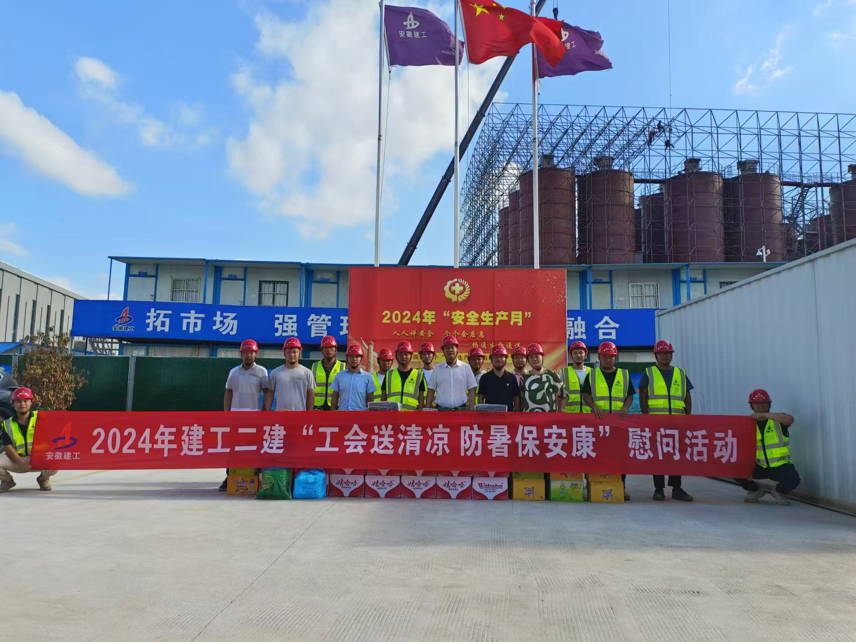驕陽似火,酷暑難耐,為做好職工防暑降溫工作,有效防控高溫中暑事件和安全生產(chǎn)事故的發(fā)生,切實維護(hù)廣大職工的勞動安全和健康,7月25日,建工二建黨委副書記、總經(jīng)理陶良敬赴安徽建工(蕪湖)新材料智能智造產(chǎn)業(yè)園項目開展送清涼慰問活動。建工建材蚌埠建材公司副經(jīng)理邵亞飛參加慰問活動。