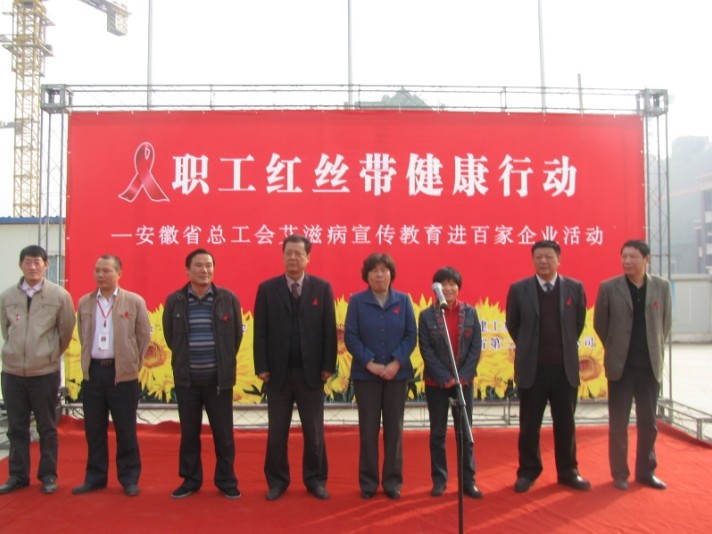 2010年11月24日上午,第23個(gè)“世界艾滋病日”即將來臨之際,由安徽省總工會(huì)、省建工集團(tuán)開展的“職工紅絲帶健康防艾宣傳進(jìn)百家企業(yè)活動(dòng)”在省二建天下錦城二期項(xiàng)目部舉行啟動(dòng)儀式,省總工會(huì)廳級(jí)巡視員、省女職工委主任牛和桂,省建工集團(tuán)工會(huì)副主席李鵬飛,工會(huì)女職工委主任胡愛紅,省二建黨委書記朱治淮、工會(huì)主席李林等出席了啟動(dòng)儀式。該項(xiàng)目部百余農(nóng)民工表示,今后要積極主動(dòng)地加入到預(yù)防和控制艾滋病的行動(dòng)中來,為遏制艾滋病在我省流行蔓延盡到應(yīng)有的貢獻(xiàn)。