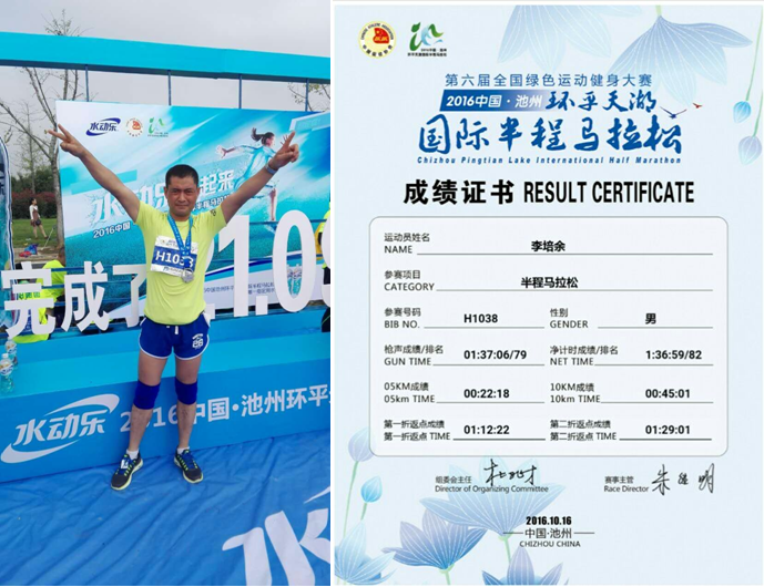 公司職工李培余在日前舉行的2016中國·池州環(huán)平天湖國際半程馬拉松比賽活動中,以1:36:59秒的成績跑完21.0975km賽程,在6000多名參賽選手中排名82位,成績驕人。