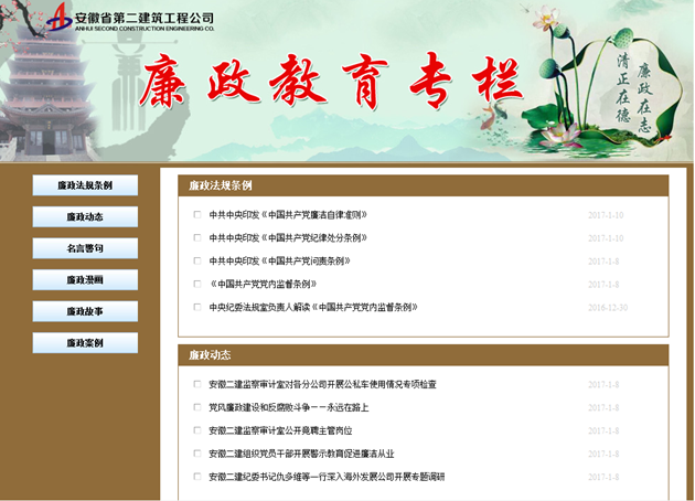 為實(shí)現(xiàn)廉政教育工作日?;?dòng)態(tài)化,同時(shí)結(jié)合省國(guó)資委、集團(tuán)紀(jì)委工作要求,經(jīng)過(guò)前期的創(chuàng)意和材料收集,在信息部的大力支持下,公司紀(jì)委《廉政教育專欄》于2017年1月10日正式上線。