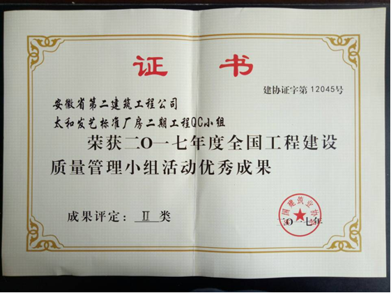 6月27—30日,安徽二建四分公司太和發(fā)藝標(biāo)準(zhǔn)廠房二期工程QC小組參加了由中國(guó)建筑業(yè)協(xié)會(huì)在四川成都主辦的全國(guó)工程建設(shè)優(yōu)秀質(zhì)量管理小組活動(dòng)成果交流會(huì)。經(jīng)過激烈的評(píng)比,太和發(fā)藝標(biāo)準(zhǔn)廠房二期工程QC小組《提高混凝土框架柱觀感質(zhì)量合格率》憑借著“高標(biāo)準(zhǔn)、嚴(yán)要求”的技術(shù)管控榮獲2017年度全國(guó)工程建設(shè)優(yōu)秀QC成果二等獎(jiǎng)。