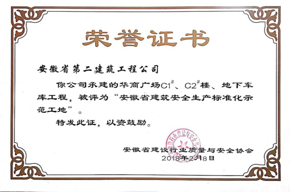 由三分公司承建的華商廣場C1、C2#樓、地下車庫項(xiàng)目與2018年2月8日正式被安徽省建設(shè)行業(yè)質(zhì)量與安全協(xié)會(huì)評為“安徽省建筑安全生產(chǎn)標(biāo)準(zhǔn)化示范工地”稱號,近日正式授牌。