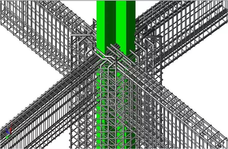在復(fù)雜節(jié)點(diǎn)的地方,鋼筋的碰撞發(fā)揮著重要的作用。在型鋼混凝土梁柱節(jié)點(diǎn)處,鋼筋數(shù)量眾多,且因?yàn)樾弯摰拇嬖冢斐闪旱目v向鋼筋無(wú)法直接拉通。BIM工程師搭建節(jié)點(diǎn)模型,對(duì)鋼筋的排布進(jìn)行調(diào)整,通過(guò)繞彎、預(yù)留洞口、焊接等方式,避免鋼筋與型鋼的碰撞。