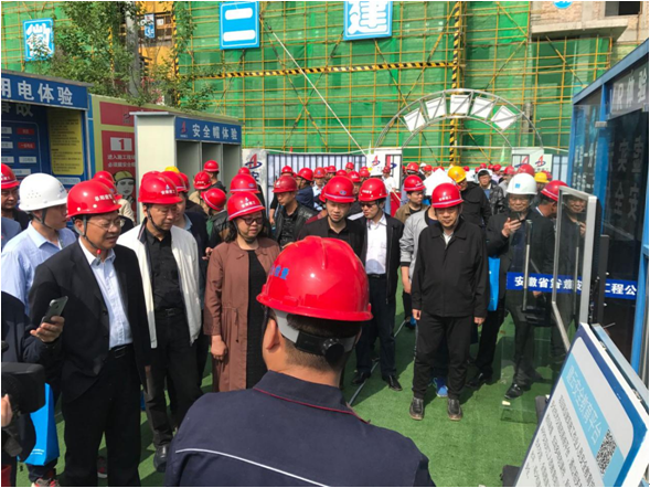 4月24日上午,阜陽(yáng)市城鄉(xiāng)建設(shè)局召開(kāi)了阜陽(yáng)市建筑施工揚(yáng)塵整治、安全生產(chǎn)、質(zhì)量管理、掃黑除惡、文明創(chuàng)建部署會(huì)暨標(biāo)準(zhǔn)化建設(shè)現(xiàn)場(chǎng)會(huì)。市城鄉(xiāng)建設(shè)局黨組書(shū)記、局長(zhǎng)海闊一行在公司副總經(jīng)理葉和永、安全總監(jiān)曹建陪同下蒞臨阜陽(yáng)廣元大學(xué)城紅街工程觀摩會(huì)現(xiàn)場(chǎng)。市城鄉(xiāng)建設(shè)局副局長(zhǎng)、市建管局局長(zhǎng)、市工程質(zhì)監(jiān)局局長(zhǎng)、各縣市區(qū)住建局負(fù)責(zé)同志、安全站(科)長(zhǎng)及阜城各在建項(xiàng)目建設(shè)單位、施工單位同志等300余人參會(huì)。