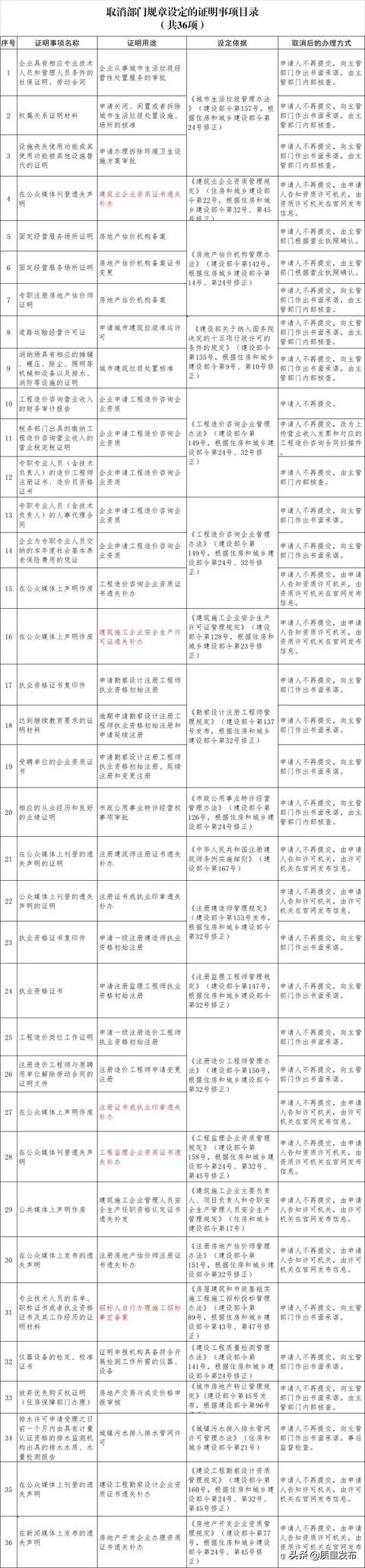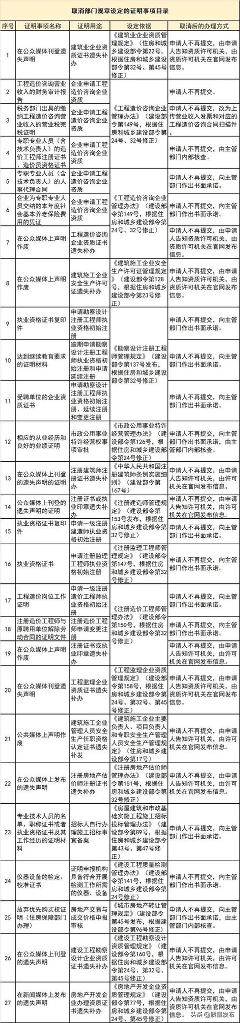 為貫徹落實(shí)黨中央、國(guó)務(wù)院關(guān)于減證便民、優(yōu)化服務(wù)的部署要求,住房和城鄉(xiāng)建設(shè)部決定取消部分部門規(guī)章和規(guī)范性文件設(shè)定的證明事項(xiàng),相關(guān)證明事項(xiàng)自公布之日起取消。