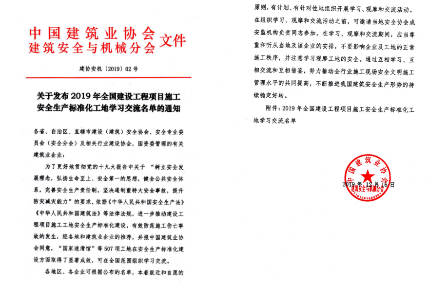 2020年1月16日,中國建筑業(yè)協(xié)會(huì)建筑安全與機(jī)械分會(huì)傳來喜訊,安徽二建承建的廣元大學(xué)城•紅街項(xiàng)目榮獲2019年度全國“建設(shè)工程項(xiàng)目施工安全生產(chǎn)標(biāo)準(zhǔn)化工地”榮譽(yù)稱號(hào)。