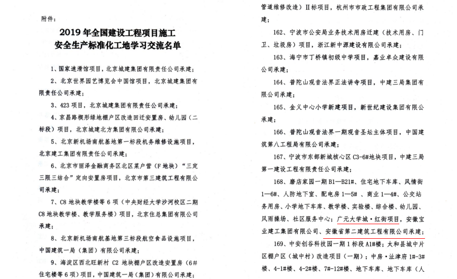 當(dāng)日下午,分公司收到《關(guān)于發(fā)布2019年全國建設(shè)工程項(xiàng)目施工安全生產(chǎn)標(biāo)準(zhǔn)化工地學(xué)習(xí)交流名單的通知》,阜陽廣元大學(xué)城紅街項(xiàng)目出現(xiàn)在名單上,這是2019年二分公司領(lǐng)導(dǎo)班子以及安全科對(duì)項(xiàng)目高度重視、嚴(yán)格管理的成果,是項(xiàng)目管理人員對(duì)創(chuàng)建工作及分公司各項(xiàng)要求的高效執(zhí)行力的結(jié)果。