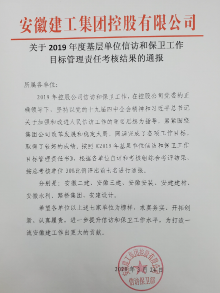 安徽二建信訪保衛(wèi)工作在公司黨委的正確領(lǐng)導下,圓滿完成了2019年度的各項工作任務。在集團信訪保衛(wèi)部組織的《2019年基層單位信訪和保衛(wèi)工作目標管理責任書》考核評比中榮獲第一名。