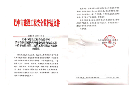 2020年5月6日,四川巴中市安全監(jiān)督站對(duì)安徽二建承建的半山逸城二期項(xiàng)目在新冠肺炎防疫疫情防控和有序復(fù)工復(fù)產(chǎn)工作進(jìn)行通報(bào)表?yè)P(yáng)。