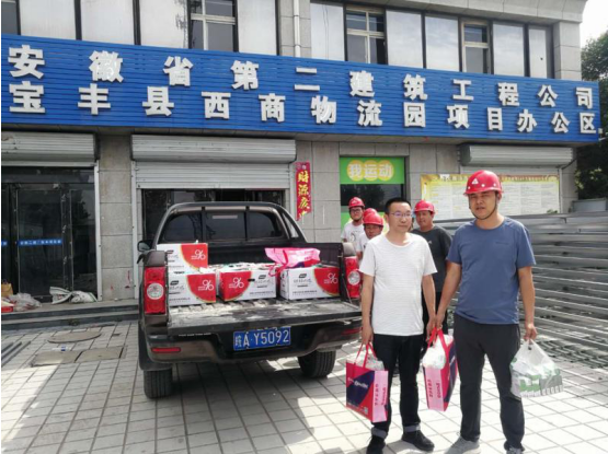 黃盱一行給項(xiàng)目員工送去慰問和關(guān)懷,準(zhǔn)備了毛巾、風(fēng)油精、十滴水、西瓜等防暑降溫用品,囑咐大家要合理安排工作時(shí)間,在做好工作的同時(shí),加強(qiáng)自身防護(hù)。