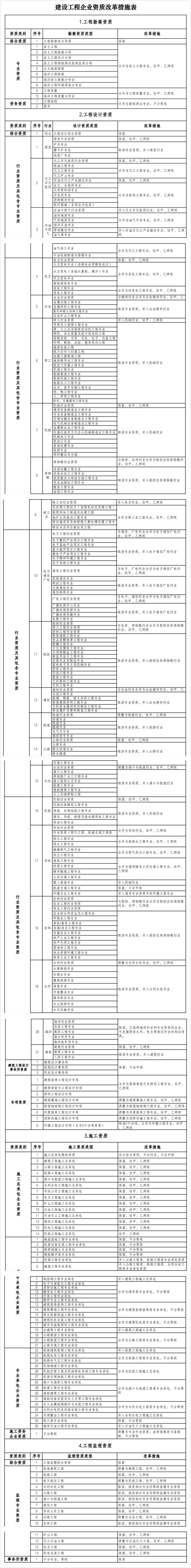 為保持資質(zhì)管理政策的穩(wěn)定性和連續(xù)性,避免對企業(yè)正常生產(chǎn)經(jīng)營造成干擾,保障工程質(zhì)量安全,在維持工程勘察、工程設(shè)計(jì)、施工、工程監(jiān)理等資質(zhì)標(biāo)準(zhǔn)框架基本不變的同時(shí),按照“能減則減、能并則并”的原則,大幅壓減企業(yè)資質(zhì)類別和等級。(詳見下文建設(shè)工程企業(yè)資質(zhì)改革措施表)對可由市場自主選擇、行業(yè)自律進(jìn)行調(diào)節(jié)的企業(yè)資質(zhì)類別予以取消。對部分專業(yè)劃分過細(xì)、業(yè)務(wù)范圍相近、市場需求較小的企業(yè)資質(zhì)類別予以合并。對部分設(shè)置過多的資質(zhì)等級進(jìn)行歸并,減少資質(zhì)層級。