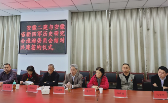 2020年10月26日下午,安徽省新四軍歷史研究會淮海委員會會長張振山,副會長徐寧寧、彭小萍、張華明、楊承愉、李茂輝以及秘書長高立共7人蒞臨安徽二建四分公司開展結(jié)對共建簽約儀式。