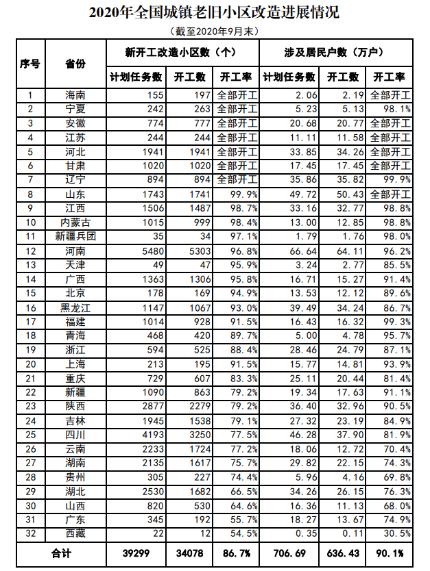 根據各地上報情況匯總統計,2020年1-9月份,全國新開工改造城鎮(zhèn)老舊小區(qū)3.41萬個,占年度計劃任務小區(qū)數的86.7%,較8月末提高了16個百分點;涉及居民636.43萬戶,占年度計劃任務戶數的90.1%,較8月末提高了13.8個百分點。