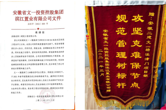 2021年3月31日,獲安徽省文一投資控股集團濱江置業(yè)有限公司表揚,并授予錦旗。