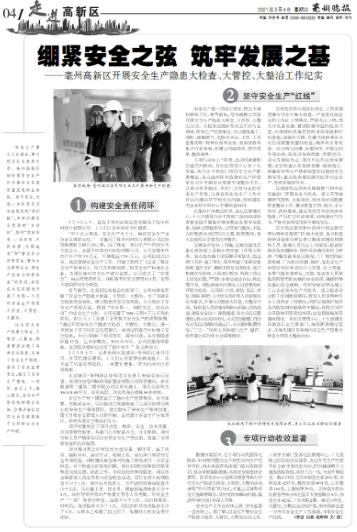 年后復工不久,亳州市高新區(qū)即對轄區(qū)內的施工單位進行逐個復工復產以及安全生產隱患大檢查、大管控、大整治。3月3日上午,亳州市高新區(qū)建管主任、第五管理中心主任、環(huán)保中心主任等領導以及亳州市記者來到亳州濱江壹號項目進行實地現場檢查,并采訪了項目經理朱曉亮。在聽取項目匯報、查閱安全管控資料后,當地各主管部門領導充分肯定了項目在現場安全、環(huán)保管控等方面的有力舉措,并在亳州晚報上刊登了項目全方位的安全管理體系。