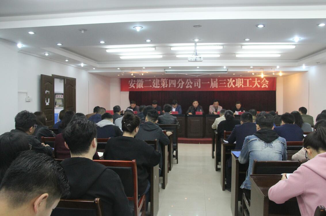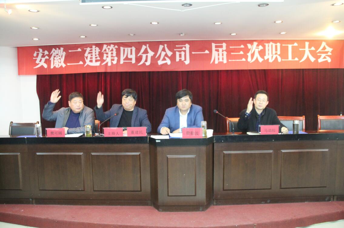 3月22日上午,安徽二建第四分公司順利召開了一屆三次職工大會(huì),公司黨委副書記、紀(jì)委書記仇多維,總經(jīng)理助理、工會(huì)副主席蒯家江,黨委工作部主任施用宏到會(huì)指導(dǎo),分公司52名職工參會(huì),支部書記董建民主持大會(huì)。