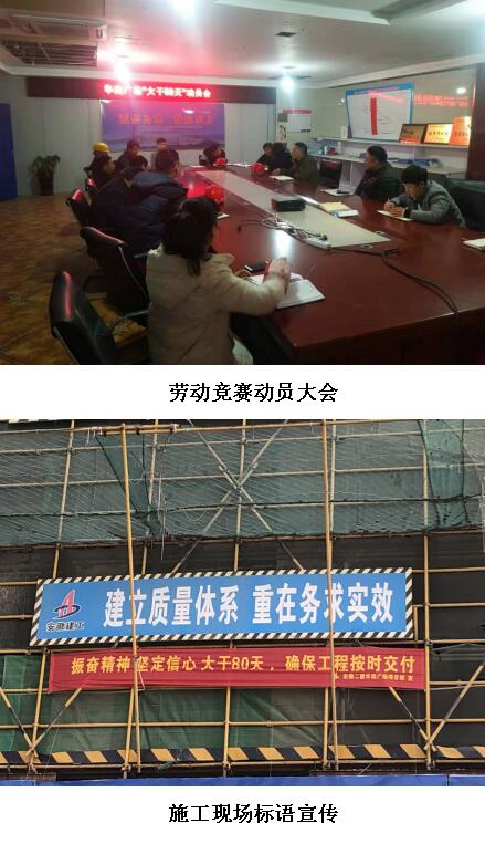 隨后,召開了勞動(dòng)競(jìng)賽動(dòng)員大會(huì),以會(huì)議的形式強(qiáng)調(diào)參賽班組搶工內(nèi)容,為順利完成施工任務(wù)提供有力保障。并與施工班組簽訂了目標(biāo)責(zé)任狀,明確了活動(dòng)目標(biāo)、意義、要求、獎(jiǎng)罰標(biāo)準(zhǔn)。