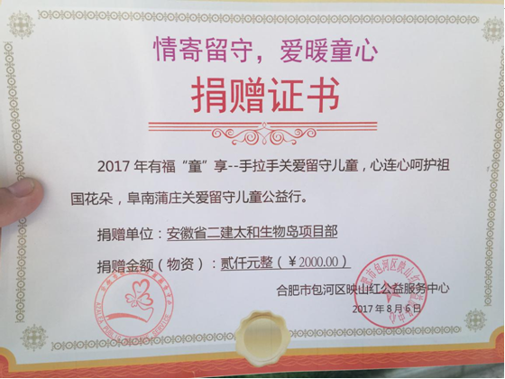8月6日,由安徽省委政研室、安徽省精神衛(wèi)生防治中心、合肥市映山紅公益服務中心主辦的“情寄留守,愛暖童心,有福童享”獻愛心公益活動在阜南縣段郢鄉(xiāng)蒲莊村張克樓小學舉行。安徽二建太和生物島一期項目部項目經(jīng)理任兵代表項目部參加了本次活動。