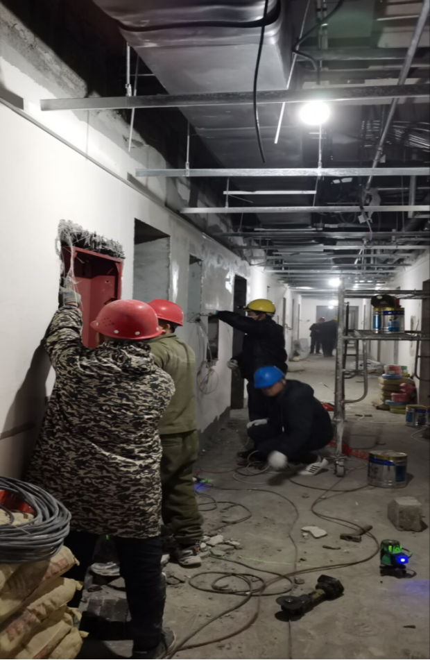自11月底接到肥東縣委縣政府主要領(lǐng)導(dǎo)指示,公共衛(wèi)生綜合樓須提前交付,投入疫情防控使用。根據(jù)公司搶工動(dòng)員大會(huì)精神,第二分公司、項(xiàng)目部迅速行動(dòng)起來,分公司領(lǐng)導(dǎo)親自指揮,全員行動(dòng),火速調(diào)配勞動(dòng)力、材料物資、機(jī)械設(shè)備等資源力量,投入搶工戰(zhàn)役。一天之內(nèi),編排好詳細(xì)的搶工倒排施工計(jì)劃、實(shí)施方案、保證措施,同時(shí)成立各作戰(zhàn)小組,確保各項(xiàng)任務(wù)如期完成。截止目前,外立面裝飾已完成,除五樓由院方負(fù)責(zé)外,各樓層水電消防橋架暖通空調(diào)智能化等穿線、管道設(shè)備安裝已全部完成,裝飾裝修進(jìn)入到攻堅(jiān)階段。地墻面磚已鋪貼完畢,油漆涂料正在收尾。病房?jī)?nèi)吊頂正在安裝,墻面冰火板已安裝鋪貼50%,pvc地板自流平地坪已完成澆筑,室外道排已完成一半,正在全力沖刺最后目標(biāo)。在搶工同時(shí),質(zhì)量和安全也毫不放松,確?!包S山杯”創(chuàng)建,優(yōu)化工藝,提升質(zhì)量標(biāo)準(zhǔn)。安全檢查日查日?qǐng)?bào),及時(shí)消除隱患。